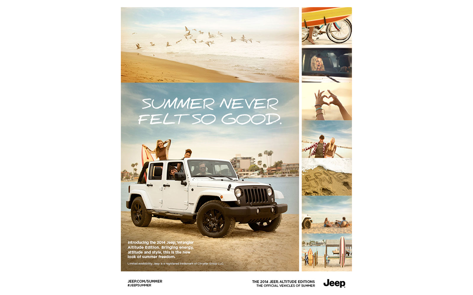 Summer is more than a season, it is an attitude. A state of mind. It is letting loose, enjoying the freedom and passion of being alive. Time becomes relative. A fleeting moment lingers for eternity. Every day is an opportunity filled with endless possibilities. In this campaign, we plunge viewers headlong into an epic summer with the new Jeep Altitude Editions. We introduce this new vehicle offering by positioning them as the center of attention, the constant enabler of unforgettable moments. They stir the craving for long days and late nights. And call fans of the season to the streets to experience style in a new way, and to make every moment selfie-worthy.
